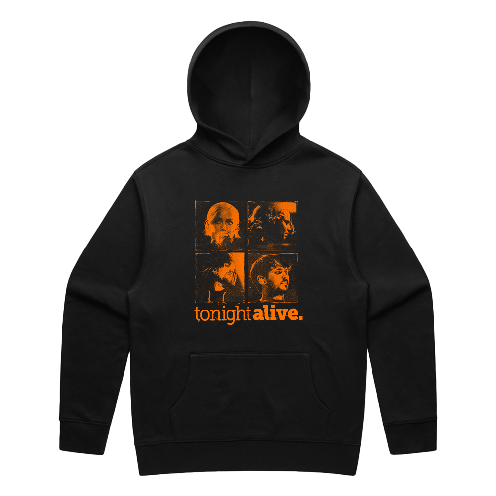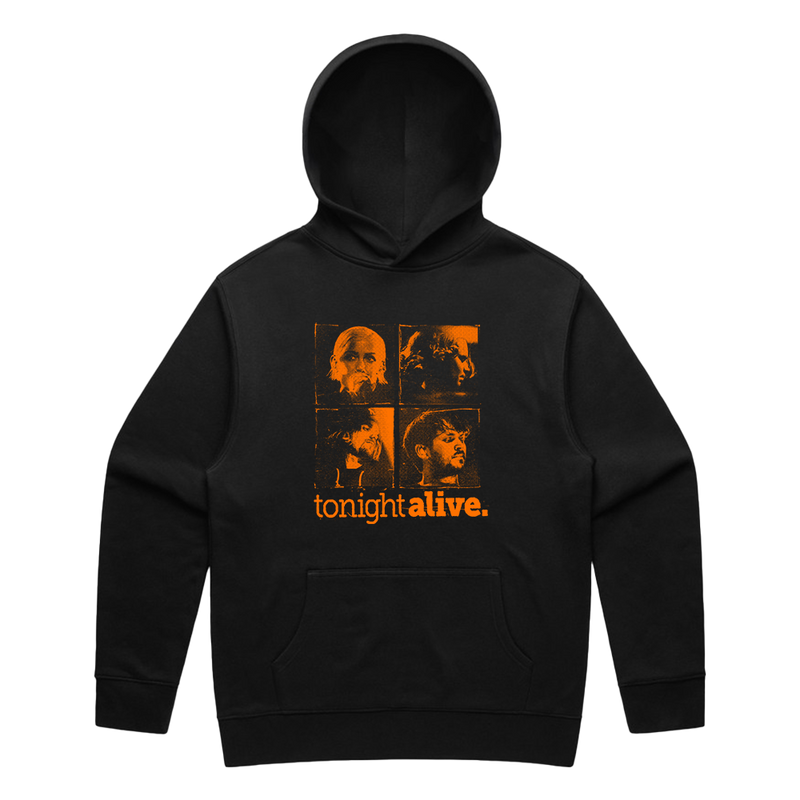 This official Tonight Alive Band Photo Hoodie features a striking orange screen print of the band on a black hoodie, offering relaxed style and comfort. Made from a mid-weight 320 GSM fleece blend of 80% cotton and 20% recycled polyester, it is pre-shrunk to reduce shrinkage. Thoughtfully designed with a pullover hood, drop shoulder, kangaroo pocket, and ribbed sleeve cuffs. Environmentally conscious, this hoodie saves approximately 8 plastic bottles from landfill per garment.